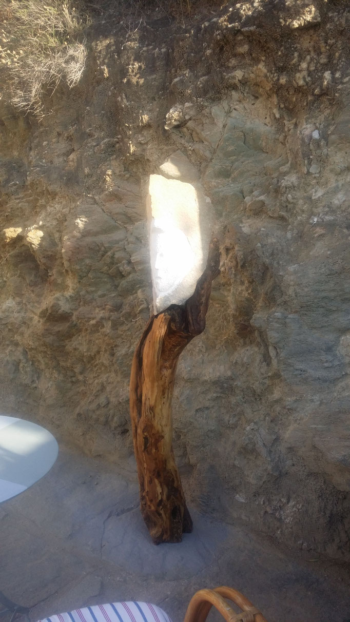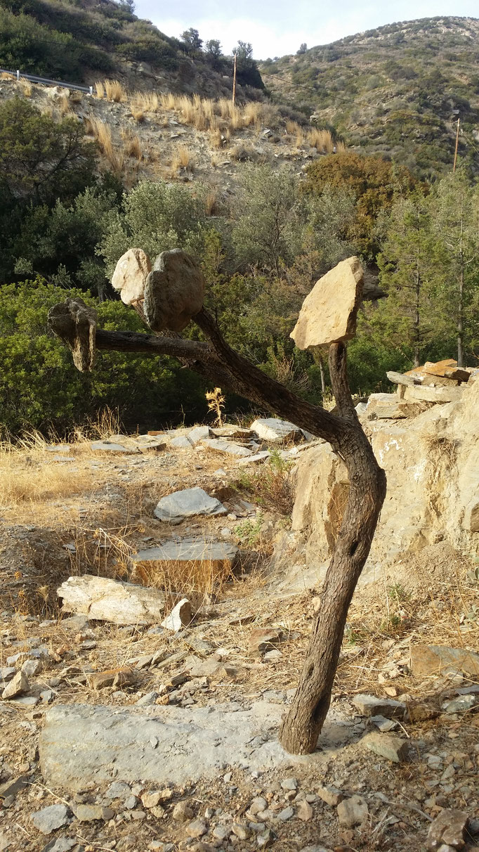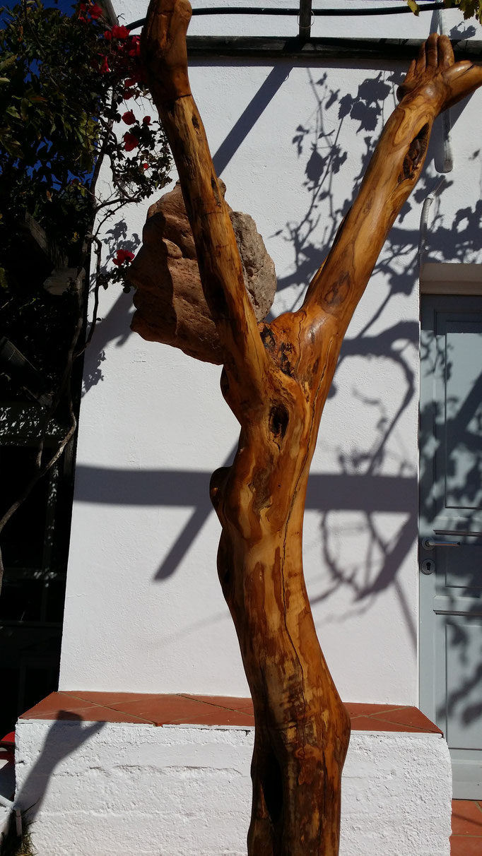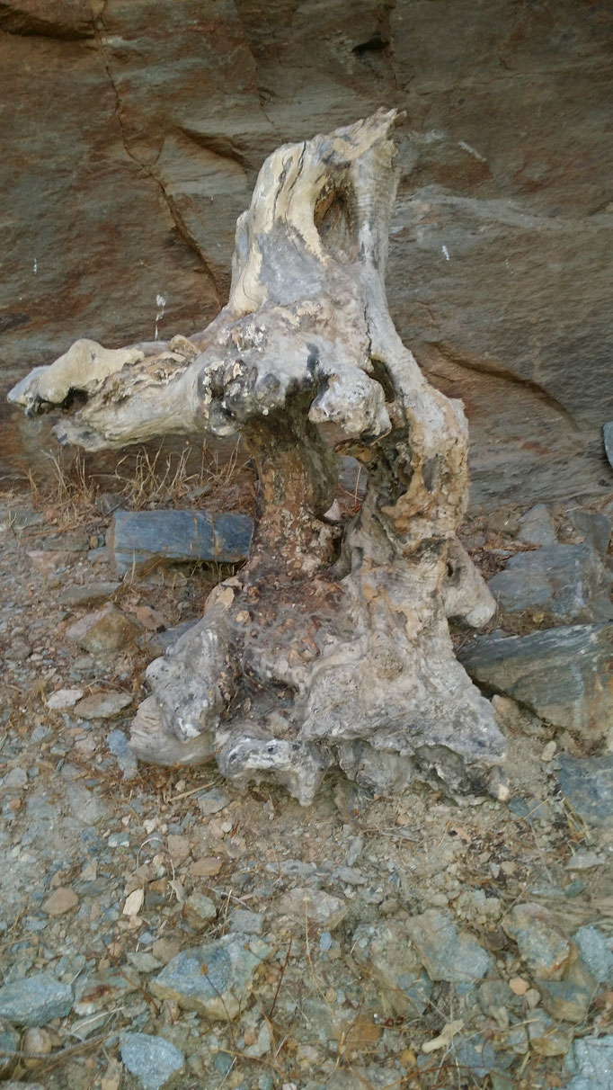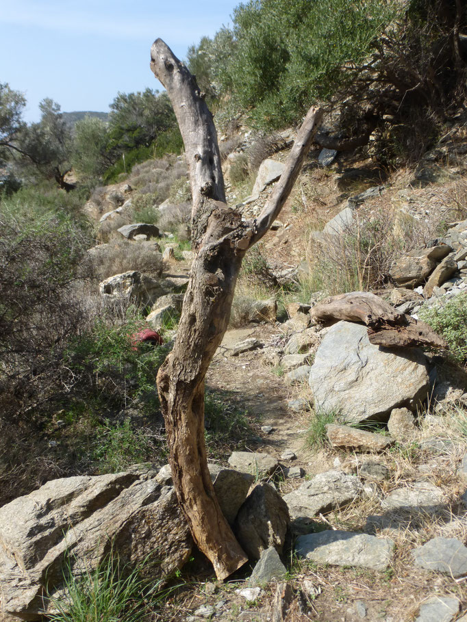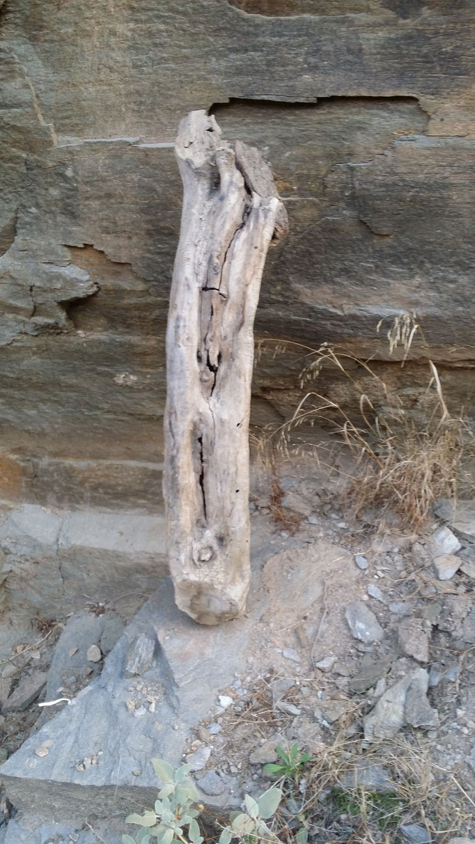 Den abgestorbenen Olivenbaumstamm fand ich im Gestrüpp und den Stein am Strand